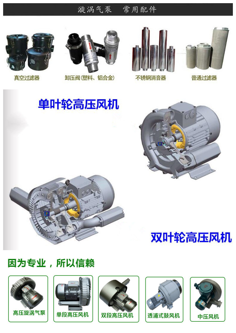 3、節(jié)能環(huán)保:高壓風(fēng)機采用ADC12材料,與奔馳的轉(zhuǎn)鼓相同。它跨越了鑄鐵的舊工藝,葉輪與其他零件沒有任何接觸,無油、無污染,具有“高、精、輕”的特點,科技含量高、節(jié)能、低碳、高品質(zhì)*優(yōu)秀產(chǎn)品。