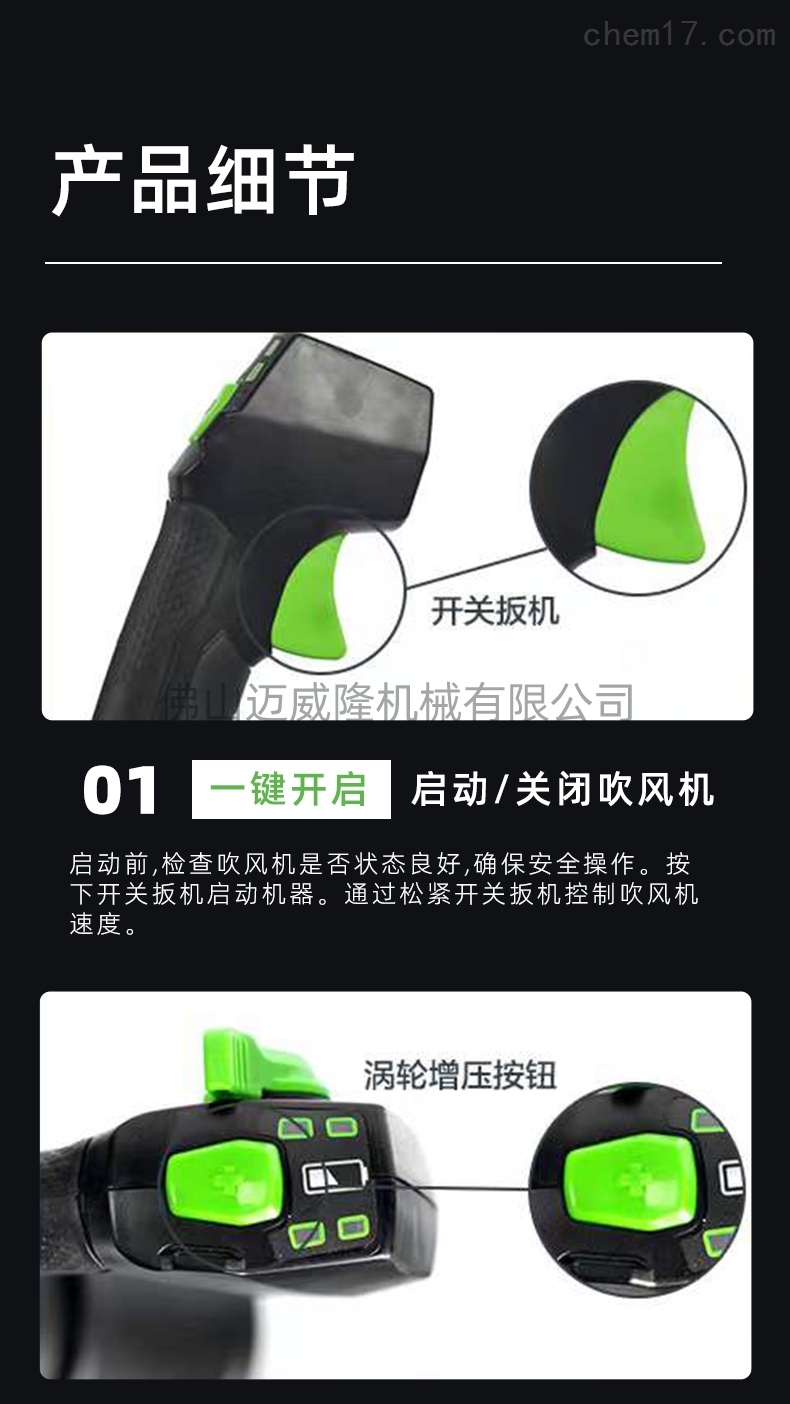產(chǎn)品特點(diǎn):glebe 80V背包式吹風(fēng)機(jī):低噪音、渦輪增壓、巡航控制、靈活輕便、耐久性長(zhǎng)、能耗低。輕便靈活,便于攜帶,一年保修,免費(fèi)計(jì)費(fèi),鋰電池設(shè)計(jì),壽命長(zhǎng),一鍵啟動(dòng),無刷電機(jī),功率強(qiáng)勁。一鍵啟動(dòng),風(fēng)速高,簡(jiǎn)單方便,風(fēng)量大,鋰電池,渦輪充電,噪音低,無需加油。操作簡(jiǎn)單、輕便、性能穩(wěn)定、散熱快、質(zhì)量可靠、值得信賴、維護(hù)成本低。無刷電機(jī),啟動(dòng)方便,風(fēng)量可調(diào),靠背舒適,使用安全。它適用于各種場(chǎng)景:在道路上吹碎石,在溫室里吹雪,在物業(yè)社區(qū)吹落葉,森林滅火,風(fēng)力滅火。
